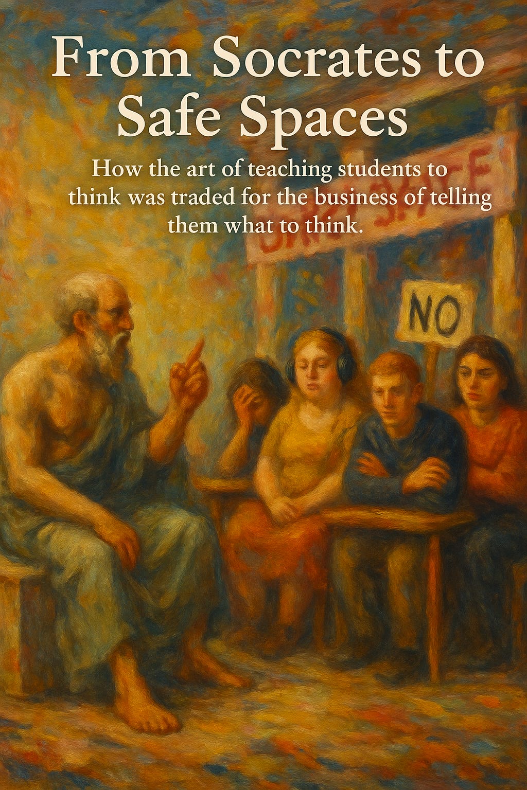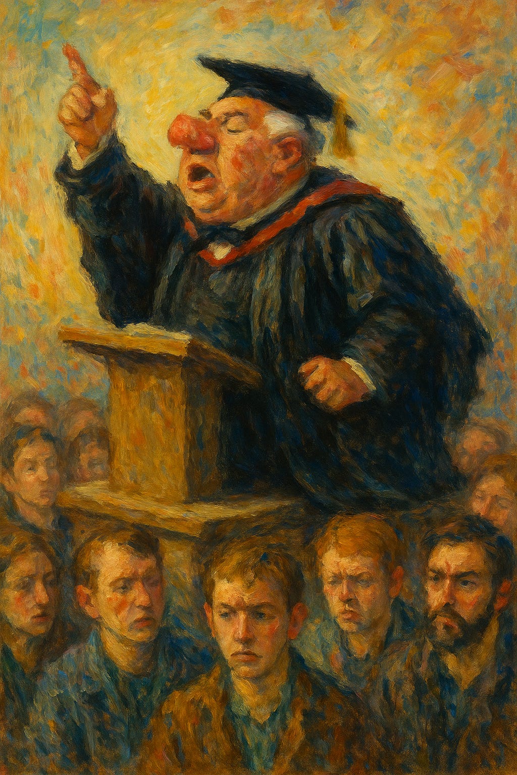 Thus, the Socratic gadfly is evicted from the classroom. In his place comes not inquiry but incantation: the soapbox, the sermon, the pulpit with PowerPoint. The syllabus is traded for scripture, the lecture hall for the revival tent.