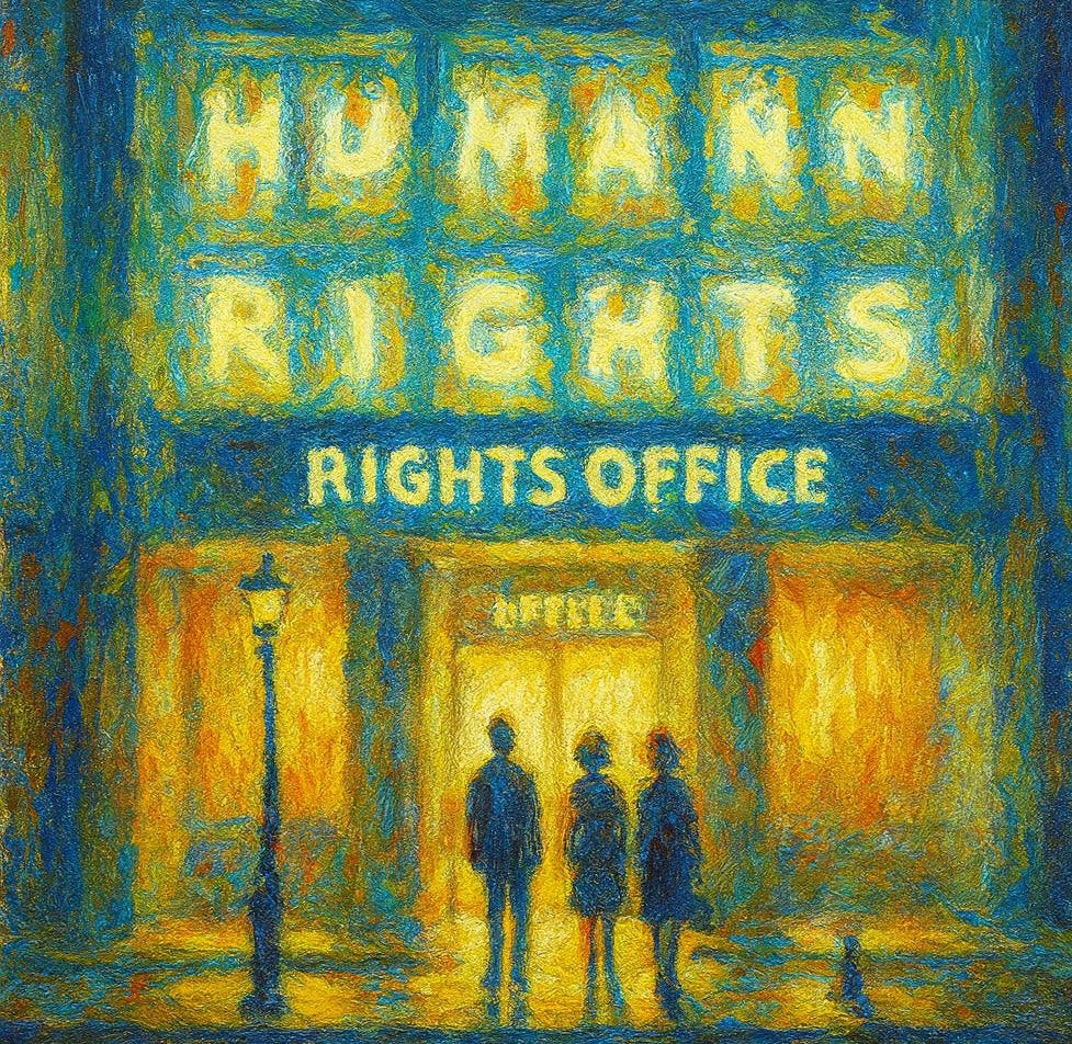 In it, I entered a room that might have been carved from Kafka’s notebook and painted by Dalí. The sign above the door flickered: the first word burned away; the last two read HUMAN RIGHTS.
