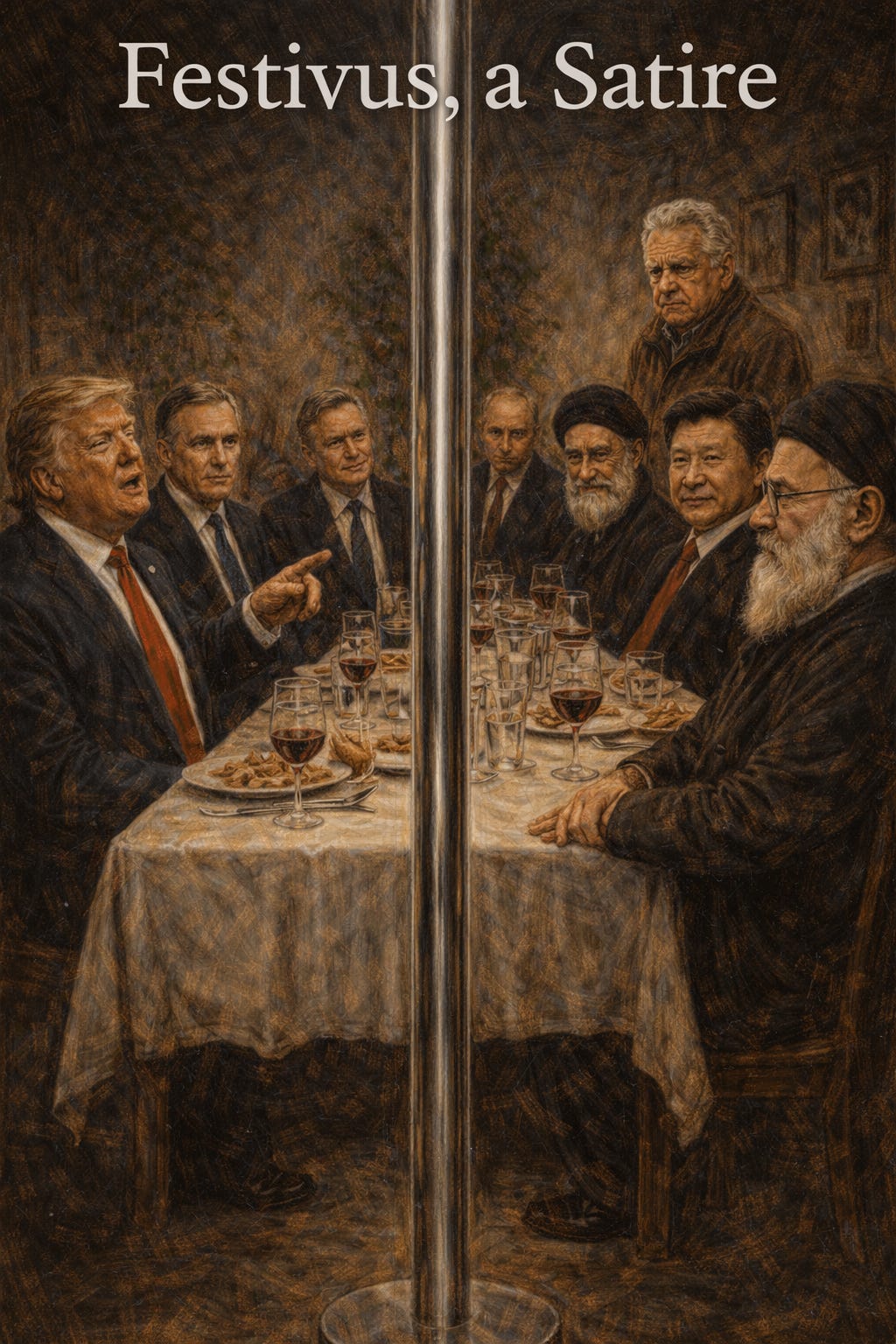 At Frank Costanza’s Festivus table, Trump, Carney, Starmer, the Ayatollah, Putin, and Xi confront the one object incapable of flattery: the aluminium pole.