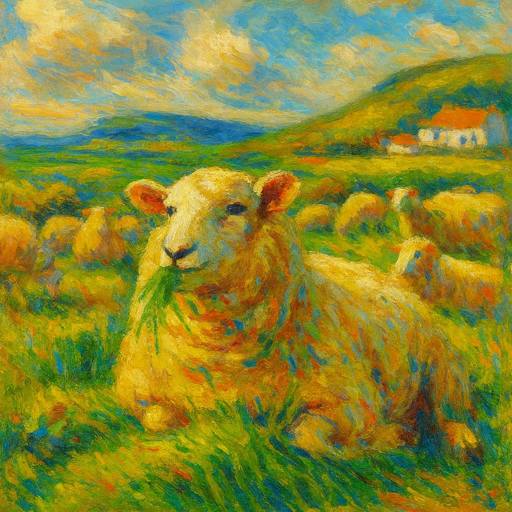 I remember the lambs on my Irish cousins’ hill, jaws working side to side with that solemn herbivore concentration, companions folded neatly on the grass, hooves tucked under like careful punctuation. Chekhov would have noticed the particulars: the click of a gate not quite shut; a thread of wool snagged on wire; a kettle beginning to think about boiling.