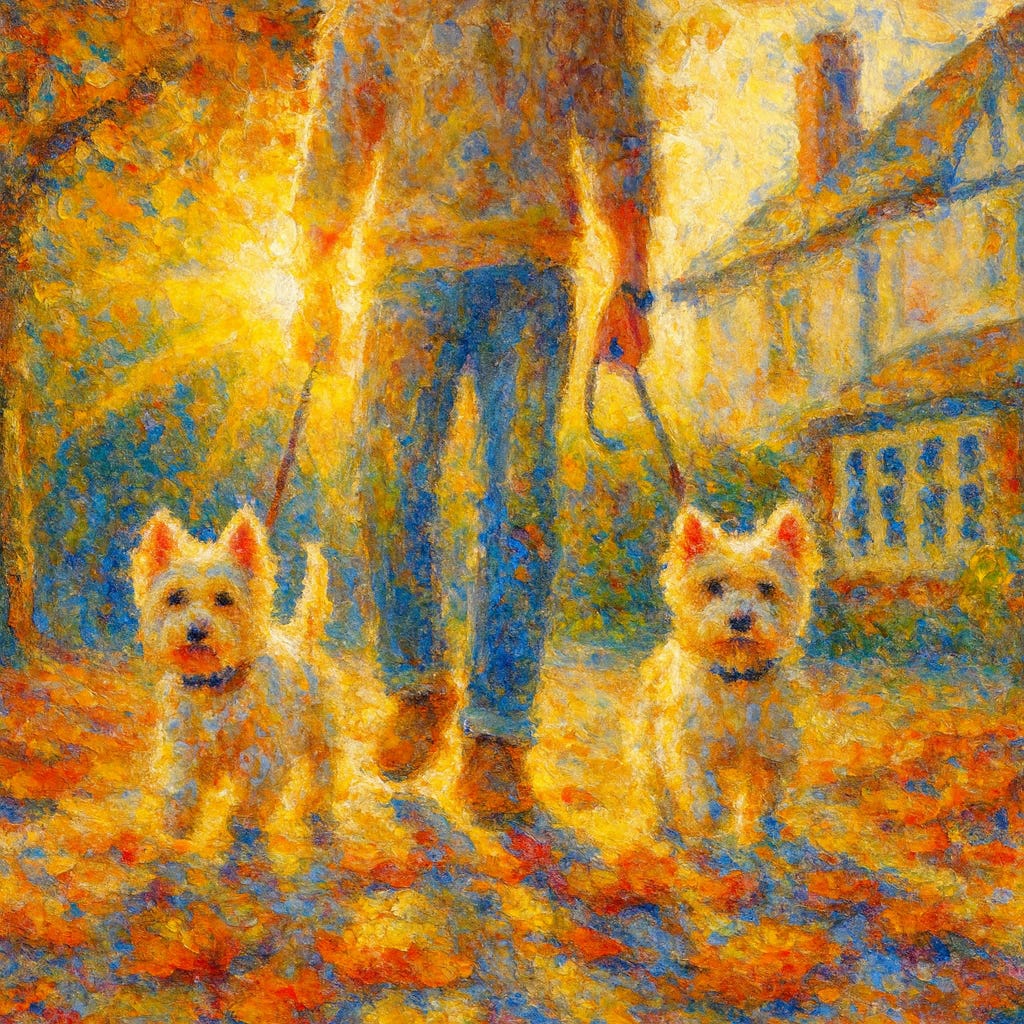 I stepped out with the dogs and was greeted by a Toronto mid-October sun doing its best imitation of late June. A surge of happiness went through me. Perhaps the photons persuaded a few neurons to stop sulking and pass notes like civilised cells; perhaps it was just one of those meteorological flukes—weather on the skin, weather in the skull. Had I earned it? Or had it arrived, like most blessings, without receipts or tracking numbers?