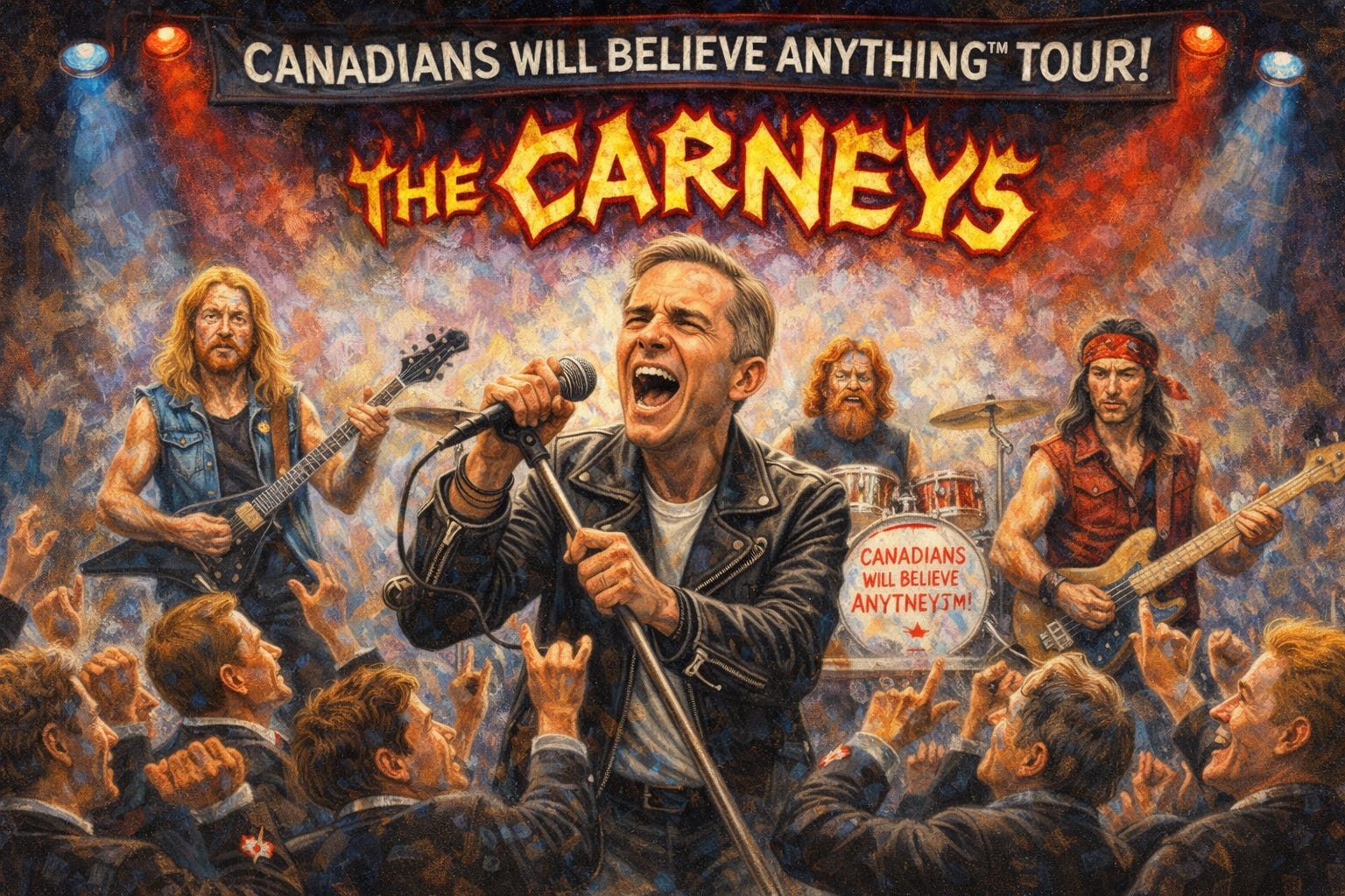 Mark Carney has embarked once again on what can only be described as the Canadians Will Believe Anything™ Tour—a travelling seminar built on a single, highly reliable premise: that Canadian voters can be persuaded to accept decline provided it is narrated slowly, calmly, and by someone with a reassuring accent.