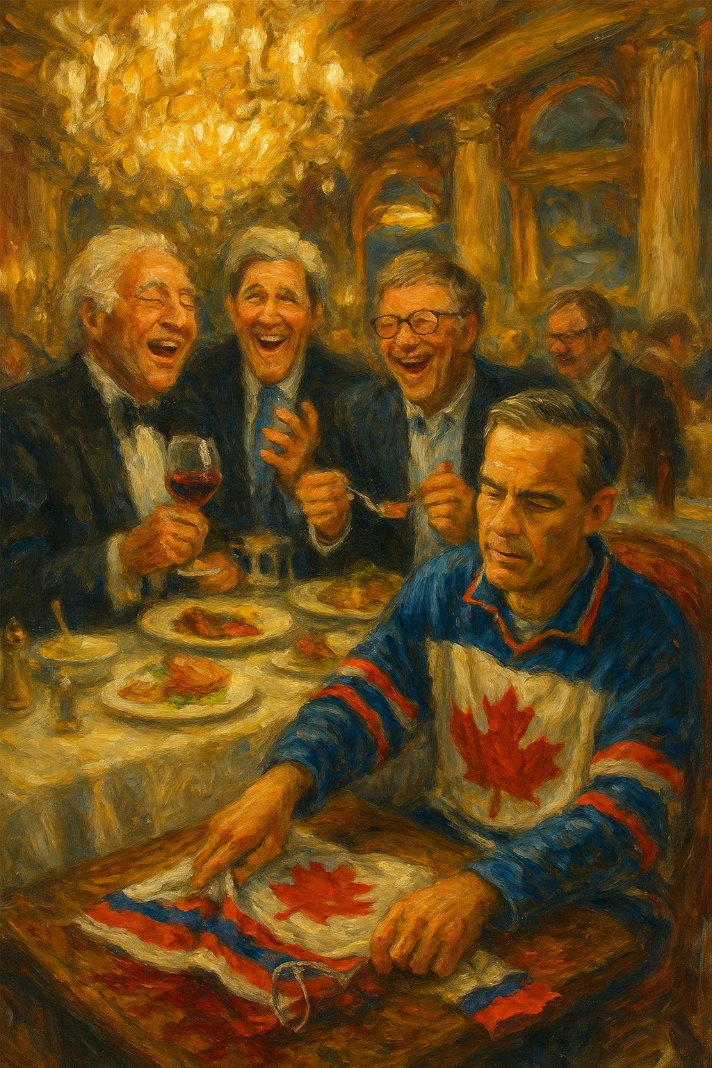 Mark Carney was caught on a secret camera hidden in the chandeliers of a Yorkville wine bar, where he’d gathered with his old Davos drinking buddies — John Kerry, George Soros, and eventually Bill Gates, fresh off a private jet the size of a small nation-state.
