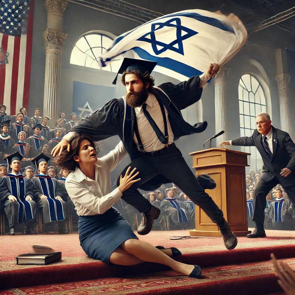 When Irish international student Aaron O’Posner crossed the stage to receive his parchment, he pulled out an Israeli flag. However, the VP quickly tackled him, and security hustled him off stage.