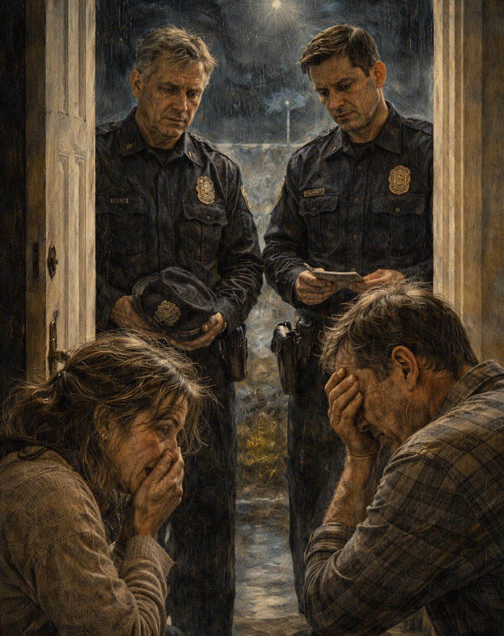Two police officers are standing on the porch. Faces composed in that terrible professional calm. And you have no idea why they are there — until they tell you your child is gone.