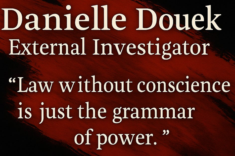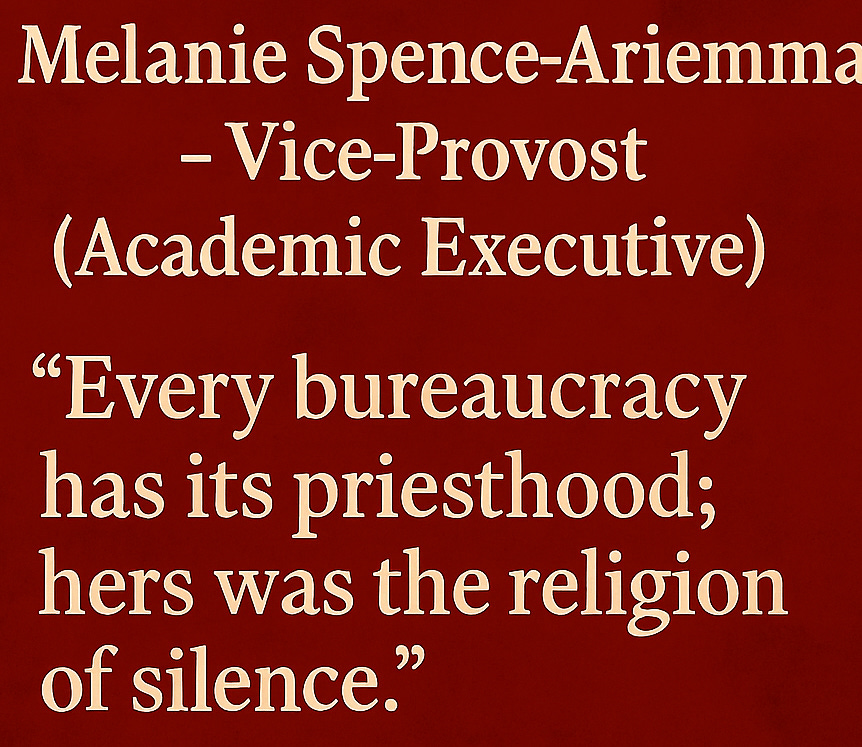 And yet even his negligence was outdone by that of Vice-Provost Melanie Spence-Ariemma, the priestess of procedural fraud, who — through intermediaries — announced on November 27, 2023, that I would be terminated.