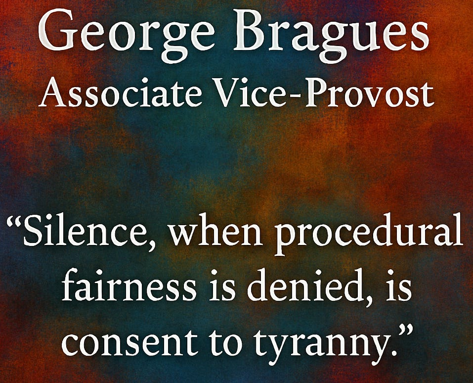 The executioners arrived, as they so often do in this country’s genteel inquisitions — in polite formation, smelling faintly of bergamot and cowardice, armed not with swords but with stationery. The first letter of dismissal came from the Provost; the second, from that same Assistant Vice-Provost — the ever-obedient George Bragues — who had once suspended me while admitting, with a kind of bureaucratic innocence, that he had “no idea why.”