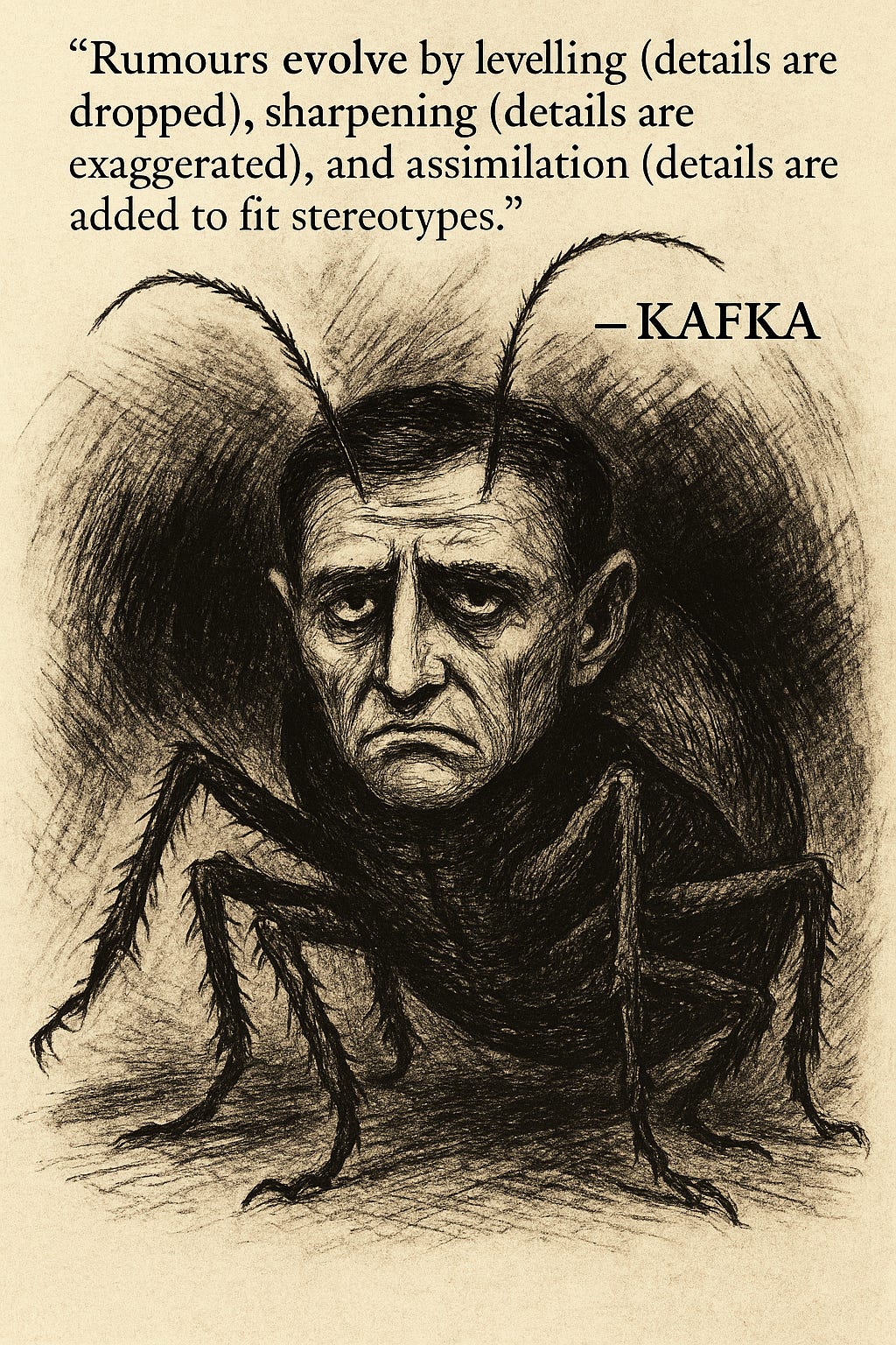 “Rumours evolve by levelling (details are dropped), sharpening (details are exaggerated), and assimilation (details are added to fit stereotypes).”