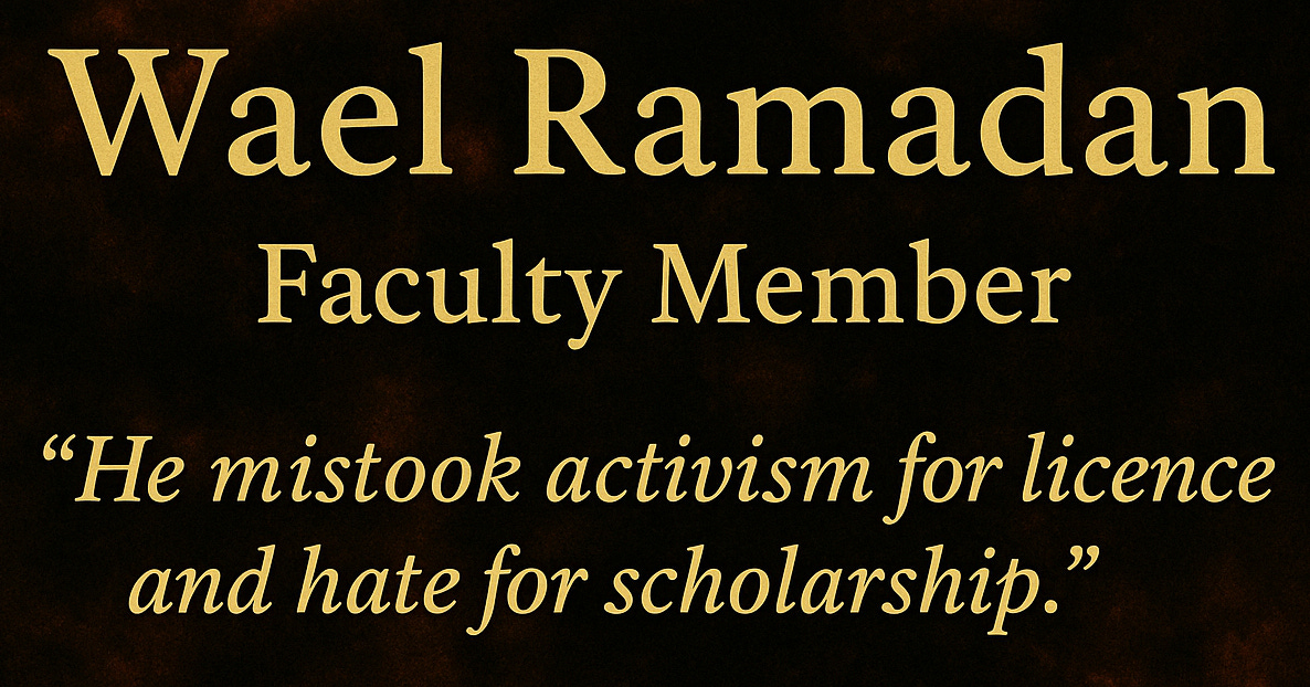 His final act of servility, my termination letter, was a masterwork of intellectual cowardice: no evidence, no reasoning, not even the decency of consistency. The original sin — “insulting Hamas” — had almost vanished. In its place, my calls for due process, for evidence, for the right to defend myself, were rebranded as harassment. My human-rights complaint against Wael Ramadan — the proud, unrepentant antisemite whose online bile could curdle light — was twisted into an act of reprisal.