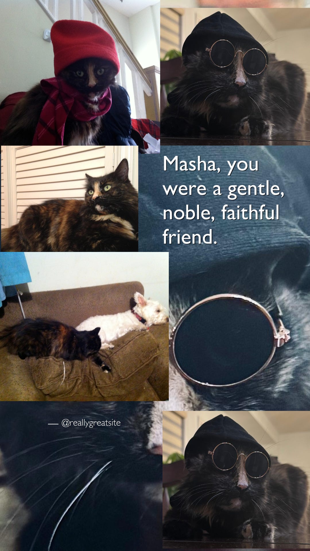 Our beloved cat, Masha, who passed away last night after sixteen wonderful years, was one of those souls. She had no ambitions beyond love. She spent hours by my wife’s side as she studied or worked, content simply to be near her.