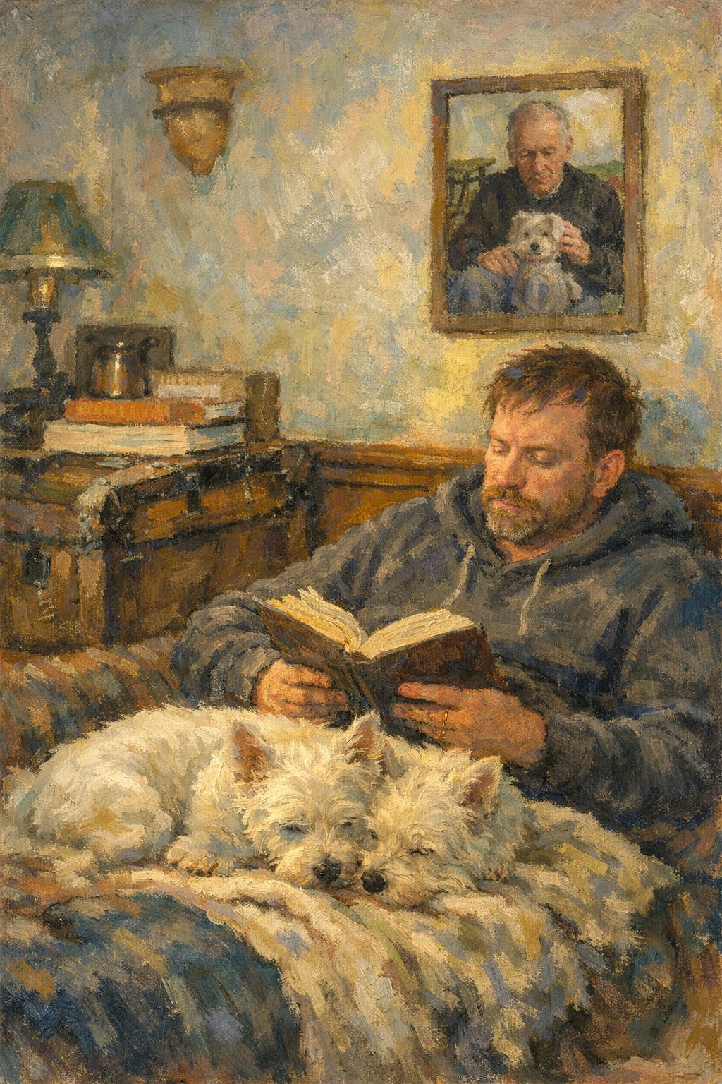 I recline on the couch—a couch, not a chair. Chairs demand posture, and posture is a kind of tyranny, whether in later years or earlier ones. At the edge of the couch, the terriers assemble. Each covets the place nearest me, as though proximity conferred rank.