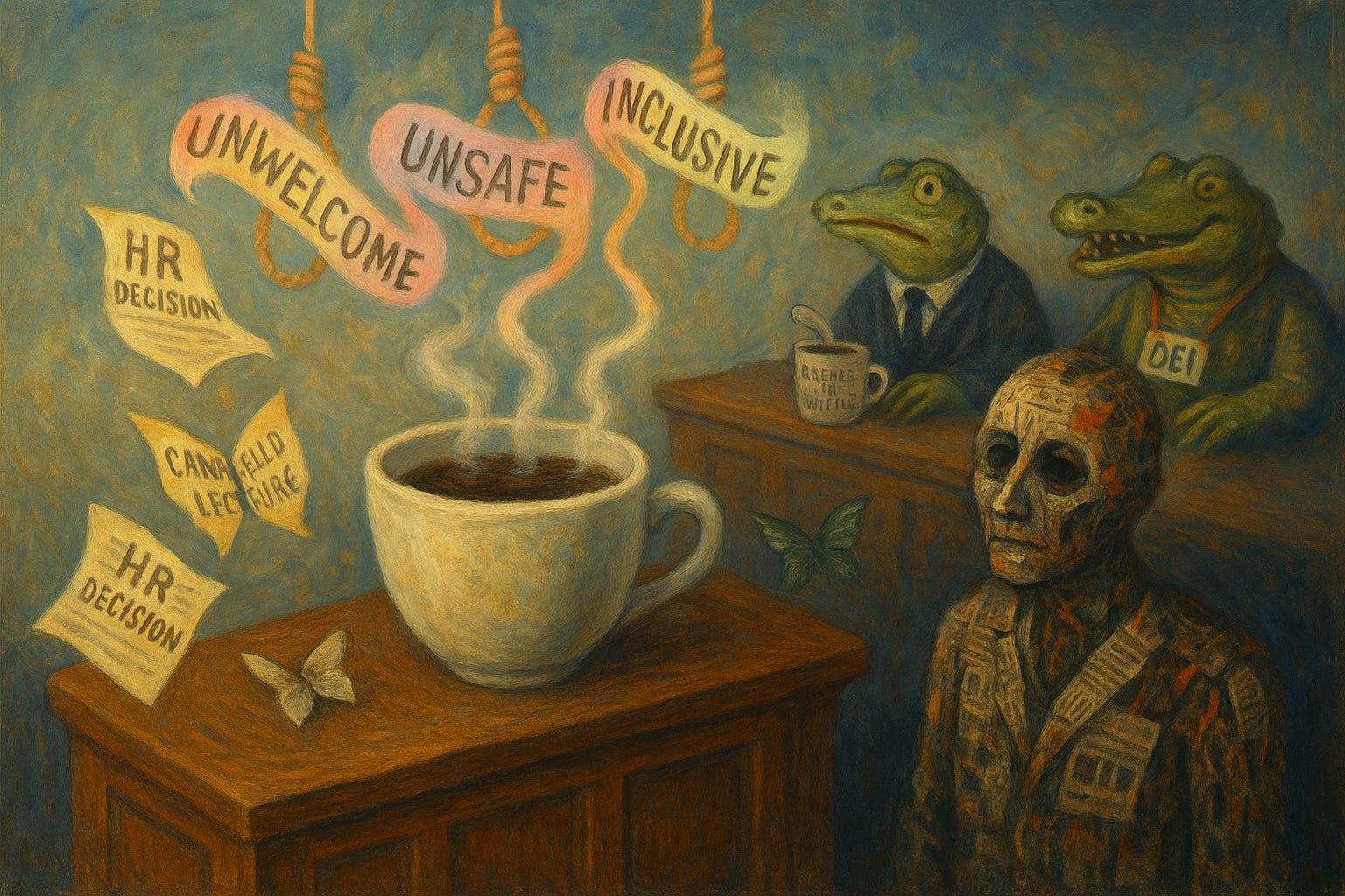 It is a peculiar trick of the modern age that tyranny no longer arrives in jackboots but in pastel tones and HR-speak, dressed in euphemisms and carried forward by email. Gone are the days of grand inquisitors and thundering verdicts. Instead, we are softly suffocated by a bureaucracy that speaks in the tongues of concern and care. The new instruments of control? Words like “unwelcome,” “unsafe,” “inappropriate,” “inclusive,” and “poisoned environment.”